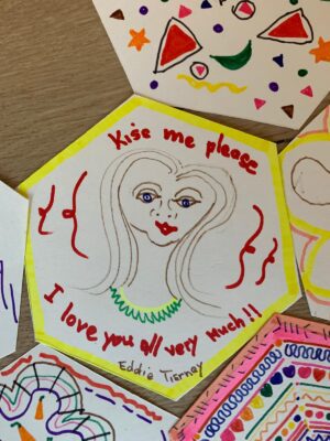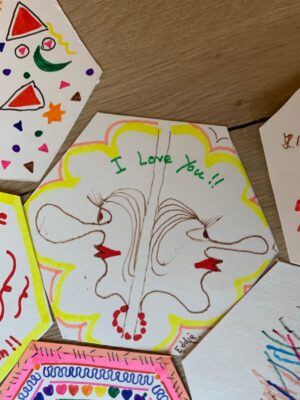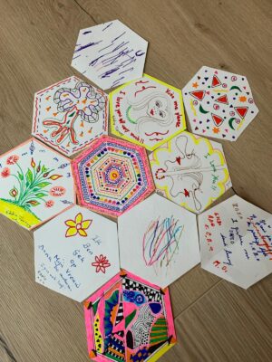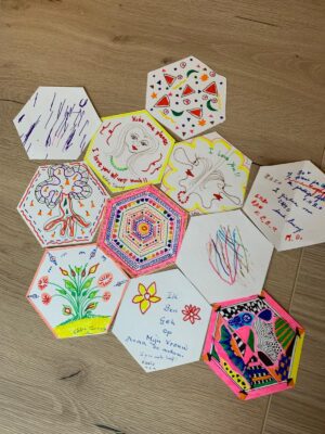 "We maken tekeningen op vooraf gesneden zeshoeken, om ze later als een raster van de zeshoeken zoals in een bijenkast bij elkaar te brengen. Alles is goed."